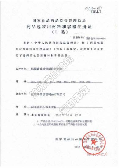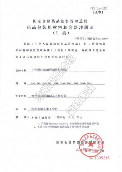 藥用包裝材料和容器注冊證—中性硼硅玻璃注射劑瓶