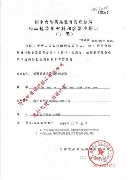 我公司“低硼硅玻璃管制注射劑瓶”“藥品包裝用材料和容器注冊證”如下:我公司“中性硼硅玻璃管制注射劑瓶”“藥品包裝用材料和容器注冊證”如下: