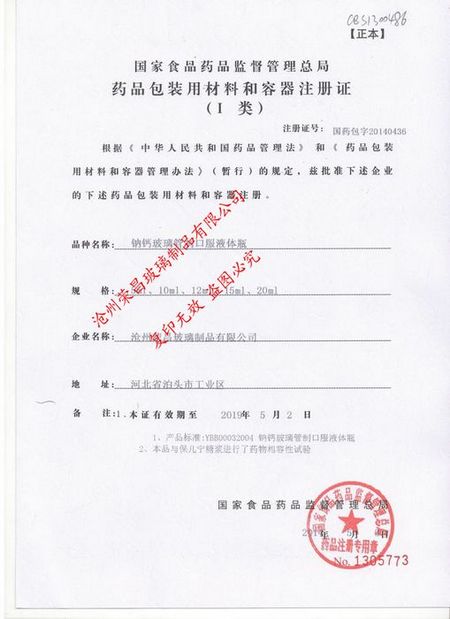 我公司“鈉鈣玻璃管制口服液體瓶”“藥品包裝用材料和容器注冊證”如下: