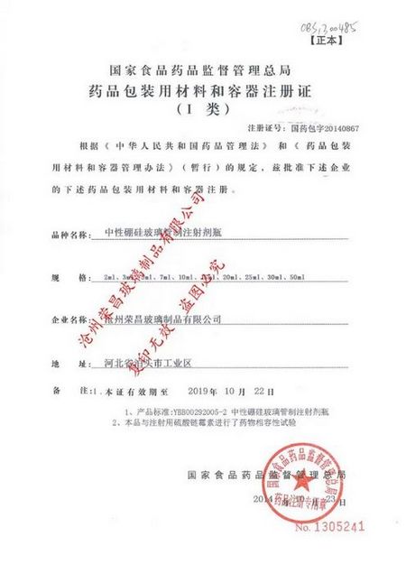 我公司全稱滄州榮昌玻璃制品有限公司,始建于1985年,公司注冊資金500萬元,坐落于河北省省級開發(fā)區(qū)-泊頭市開發(fā)區(qū),是滄州泊頭市地區(qū)唯一一家具有國家食品藥品監(jiān)督管理局頒發(fā)的“藥品包裝用材料和容器注冊證” 的企業(yè),擁有多個藥包材證書。