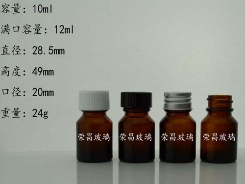 10ml棕色玻璃瓶:適用于承裝各種液體制劑,包括藥品,試劑,化妝品等。容量10ml,直徑28.5mm,高度49mm,口徑20mm,重量24g。