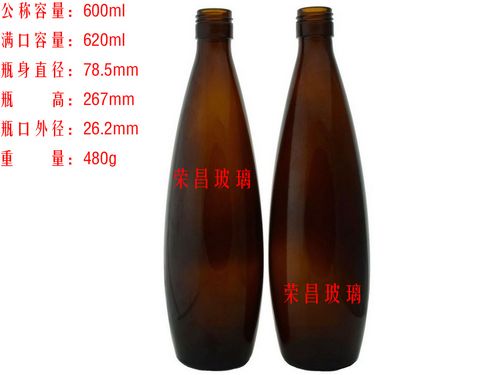 600棕色飲料瓶采用藥用食品級(jí)別鈉鈣玻璃制造而成,不含任何重金屬,瓶型美觀大方。600ml飲料玻璃瓶詳細(xì)參數(shù)如下:公稱容量:600ml,滿口容量:620ml,瓶身直徑:78.5mm,瓶高:267mm,瓶口外徑:26.2mm,重量:480g。